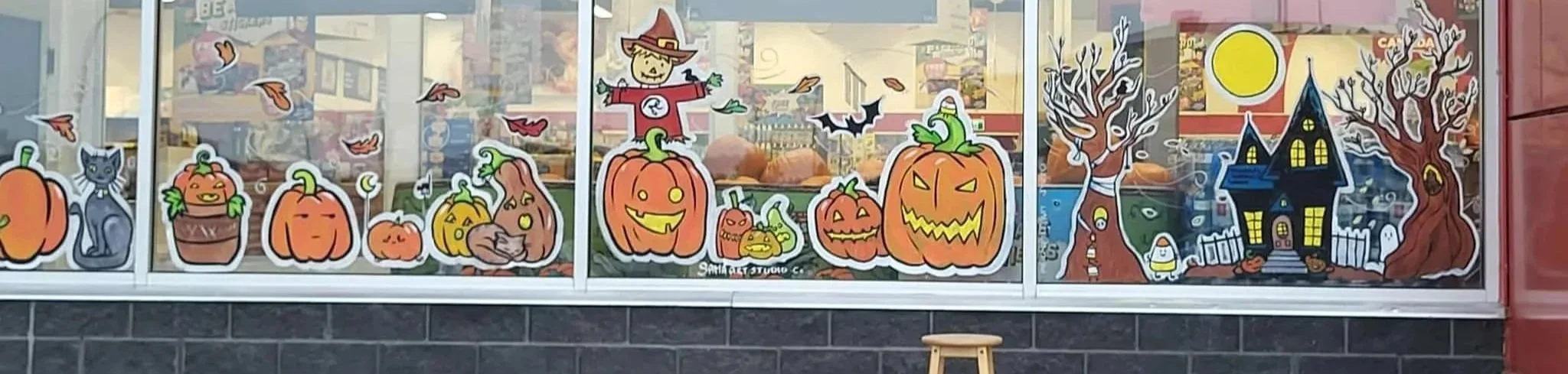 Our Community Window Painting Autumn Season Begins with Mitch’s Independent! Such a great way to provide support, beauty and fun to our community !